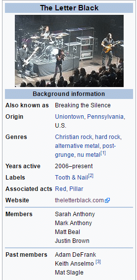 The Letter Black was formerly known as Breaking the Silence and started in Uniontown, Pennsylvania in 2006. The band consists of Sarah (vocals) and Mark Anthony (guitar), who are married, Matt Beal (bass) and Justin Brown (drums). They are classified in the genres of rock, hard rock, alternative metal, post-grunge and nu-metal. Many of their earlier songs reflect the feelings they had as a result of being hurt by people in their church. You can experience the feelings of working through bad relationships with people and coming out on the side of forgiveness, yet a severing of ties with those that did damage in their lives. Former members of the band were Adam DeFrank, Keith Anselmo and Matt Slagle. Although they raised money for their upcoming album on Kickstarter, they have signed with